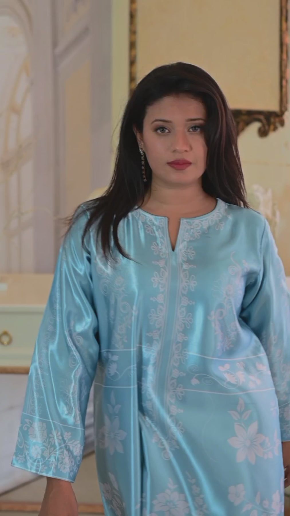 The Elysian Bloom Kaftan is a statement of elegance. This sky-blue masterpiece adorned with delicate floral accents, it strikes a perfect balance between comfort and modern charm. Its flowing silhouette, relaxed fit, wide sleeves, and detailed borders make it the perfect choice. This kaftan is perfect for both day and evening occasions — from refined gatherings to special events at home.