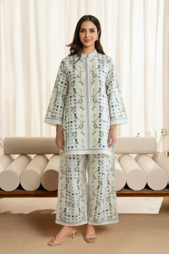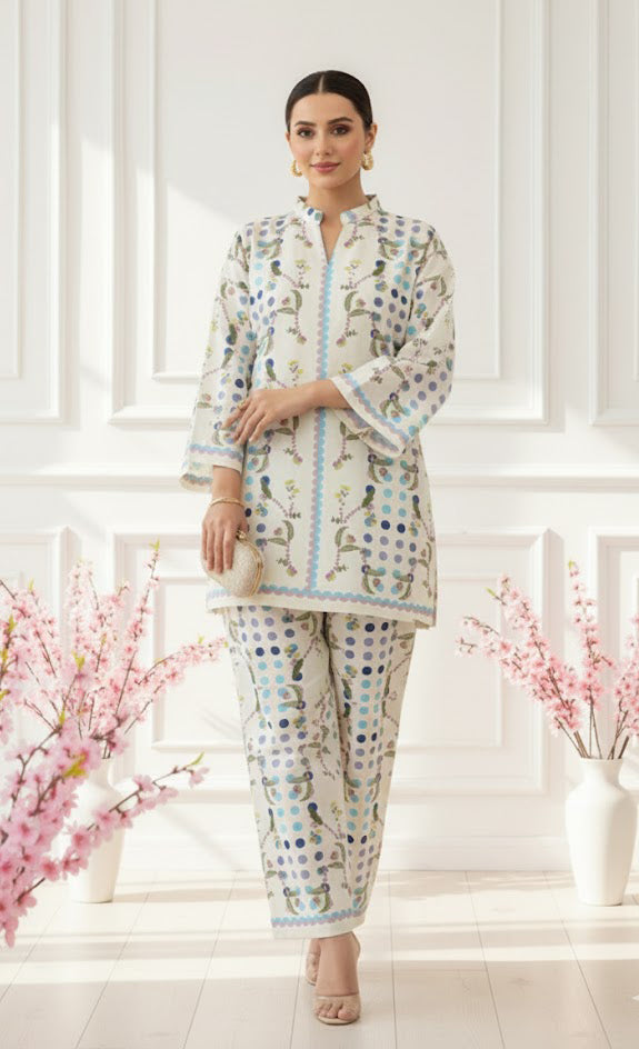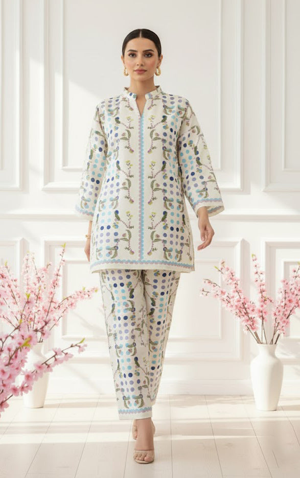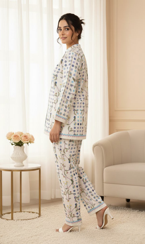 The Meadow Mist Co-Ord Set is a graceful two-piece outfit featuring a printed shirt with matching trouser. Made from soft, lightweight and luxurious crepe fabric, it offers a comfortable fit with an elegant drape. The delicate floral dotted patterns and soothing colors create a fresh, effortless look. This co-ord set balances comfort and chic sophistication.