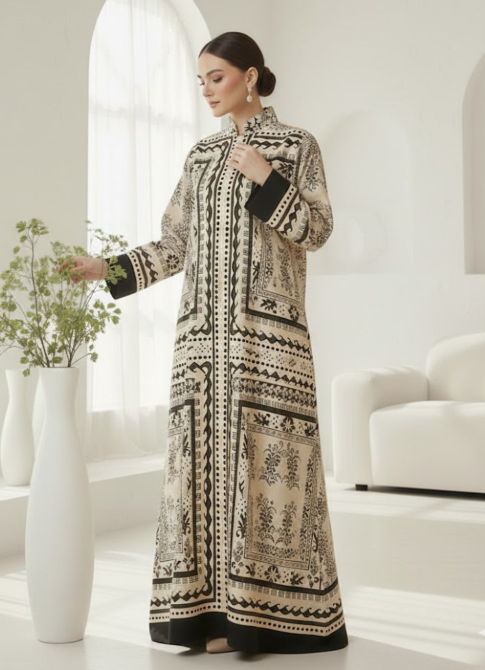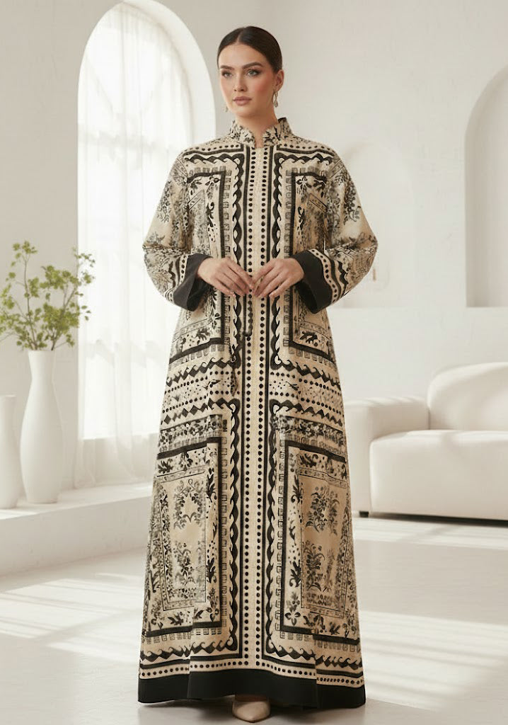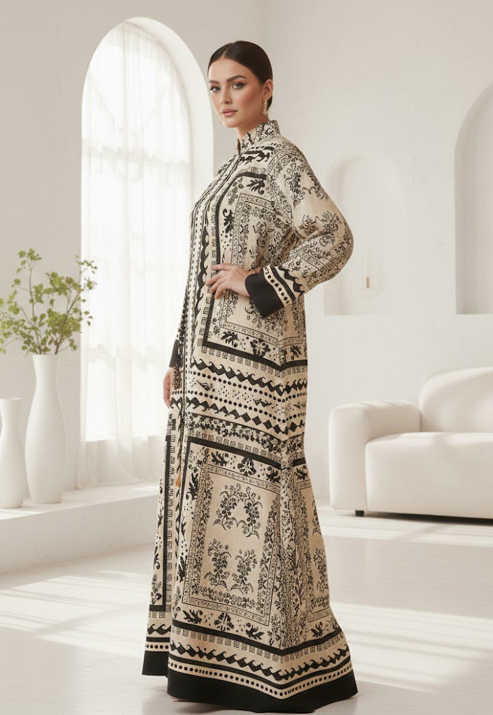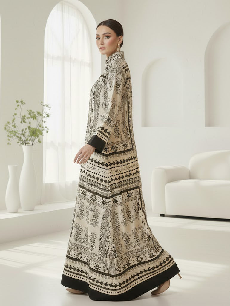 Step into elegance with our Amara Noir Kaftan, crafted from premium soft and breathable crepe fabric for a graceful fall and effortless comfort. It features a stylish modern design inspired by traditional artistry. With its elegant patterns, structured front detailing, and flowing silhouette, this kaftan creates a refined and graceful look _ A stunning piece that makes every woman feel confident and beautifully refined. Style it with minimal accessories for a chic daytime look, or elevate it with statement jewelry for special occasion.