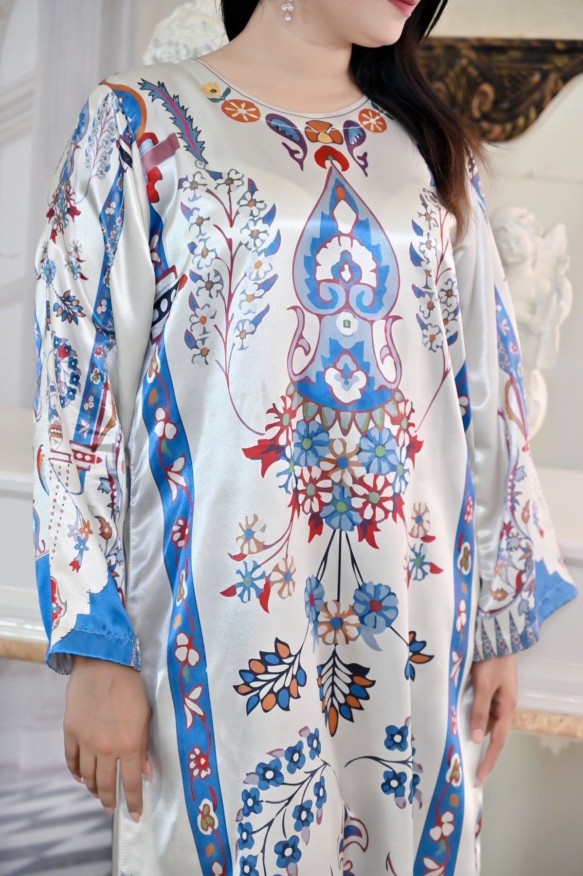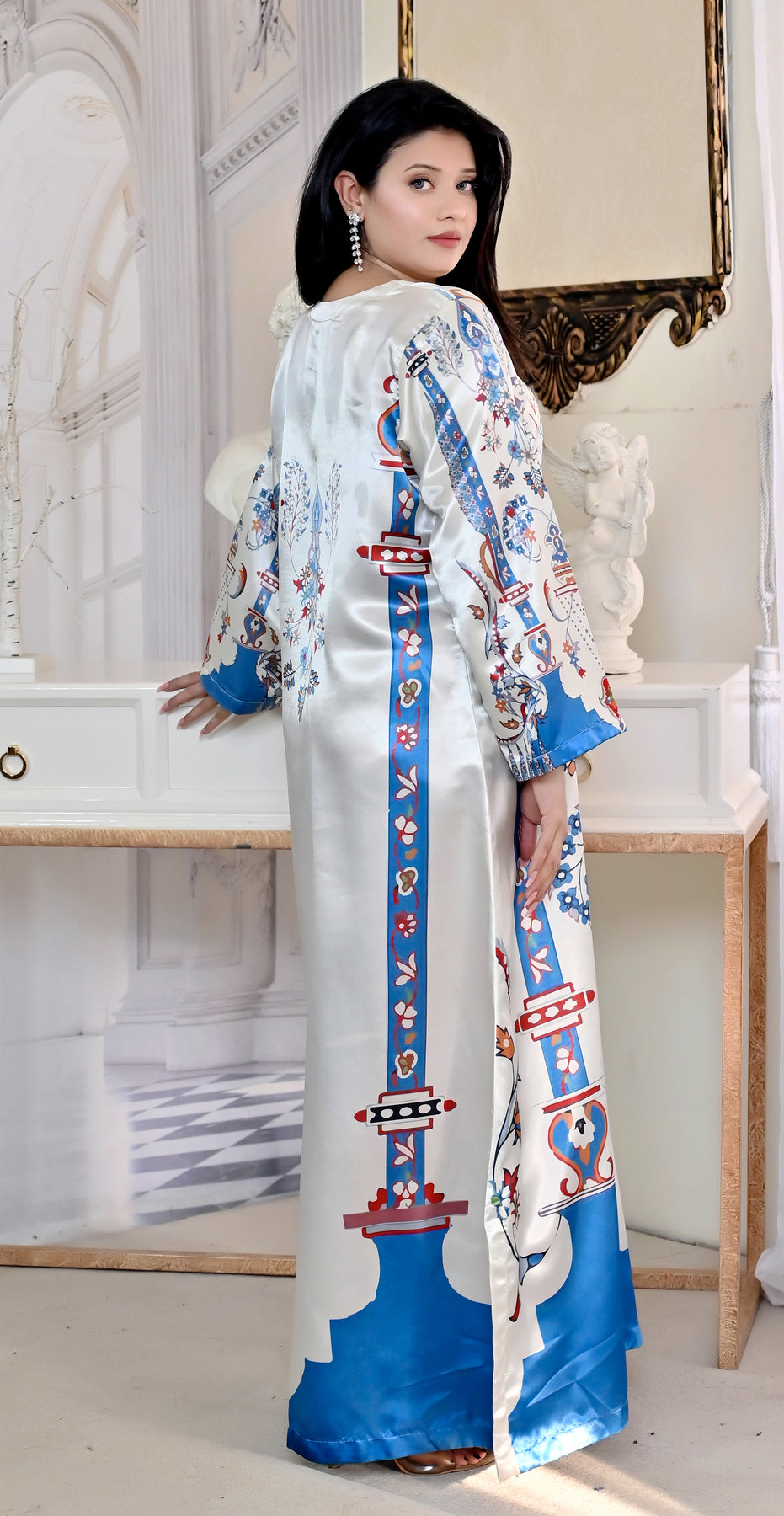 The Azure Blossom Kaftan, crafted with a smooth finish and adorned with vibrantand ornamental prints. This kaftan combines comfort with style, making it the perfect choice for both casual gatherings and special occasions. Its flowy silhouette drapes beautifully, giving you a graceful and stylish look.