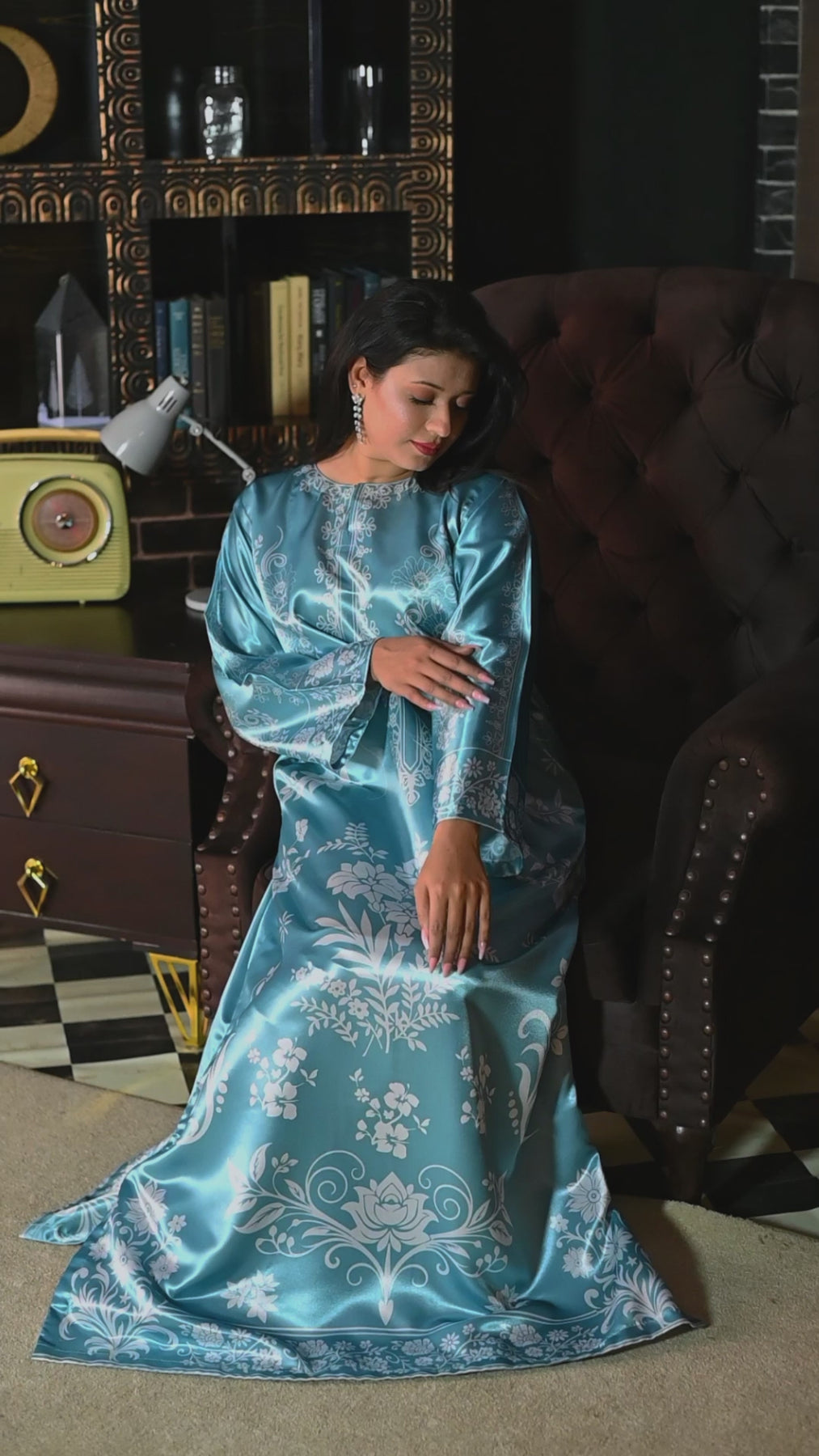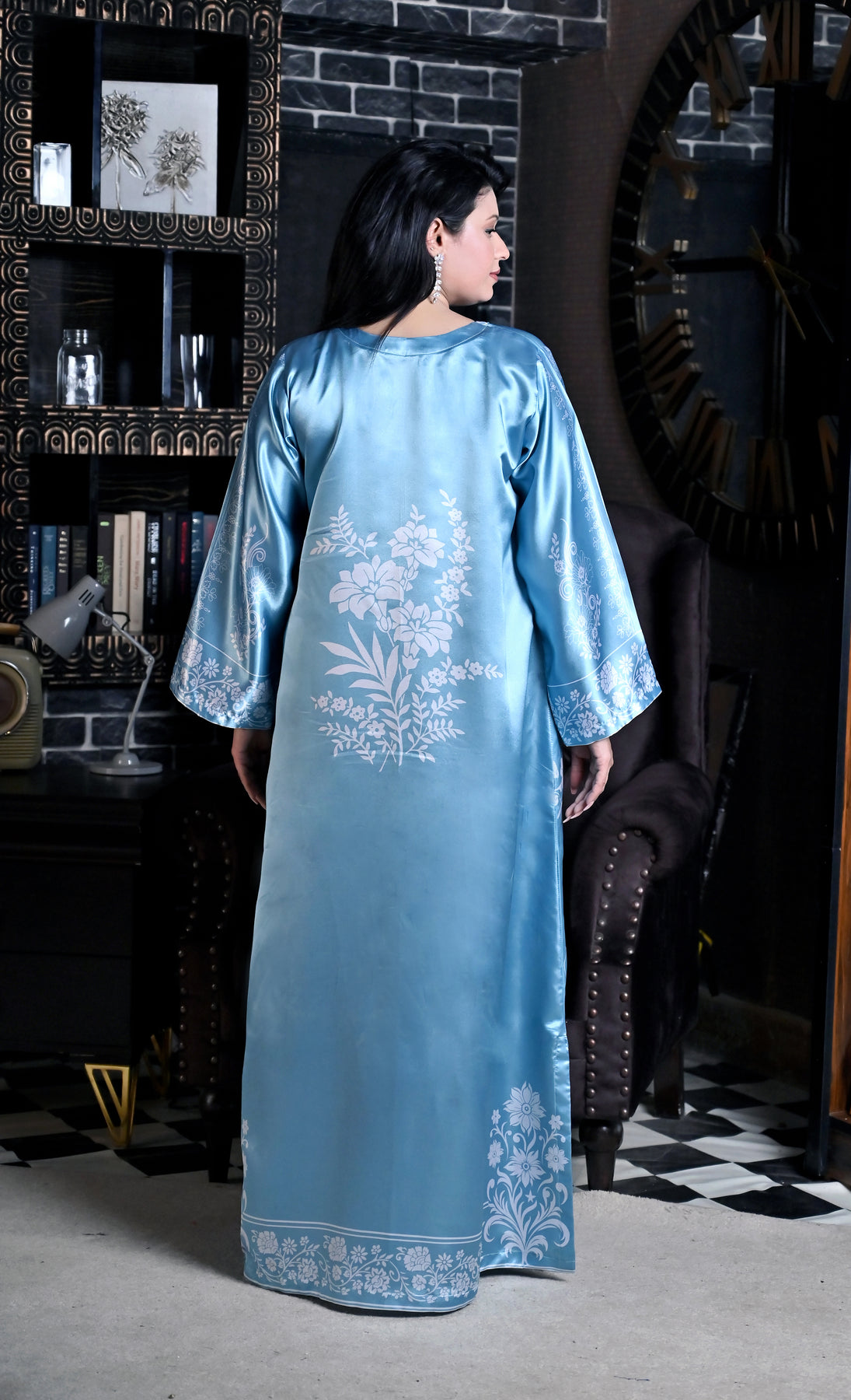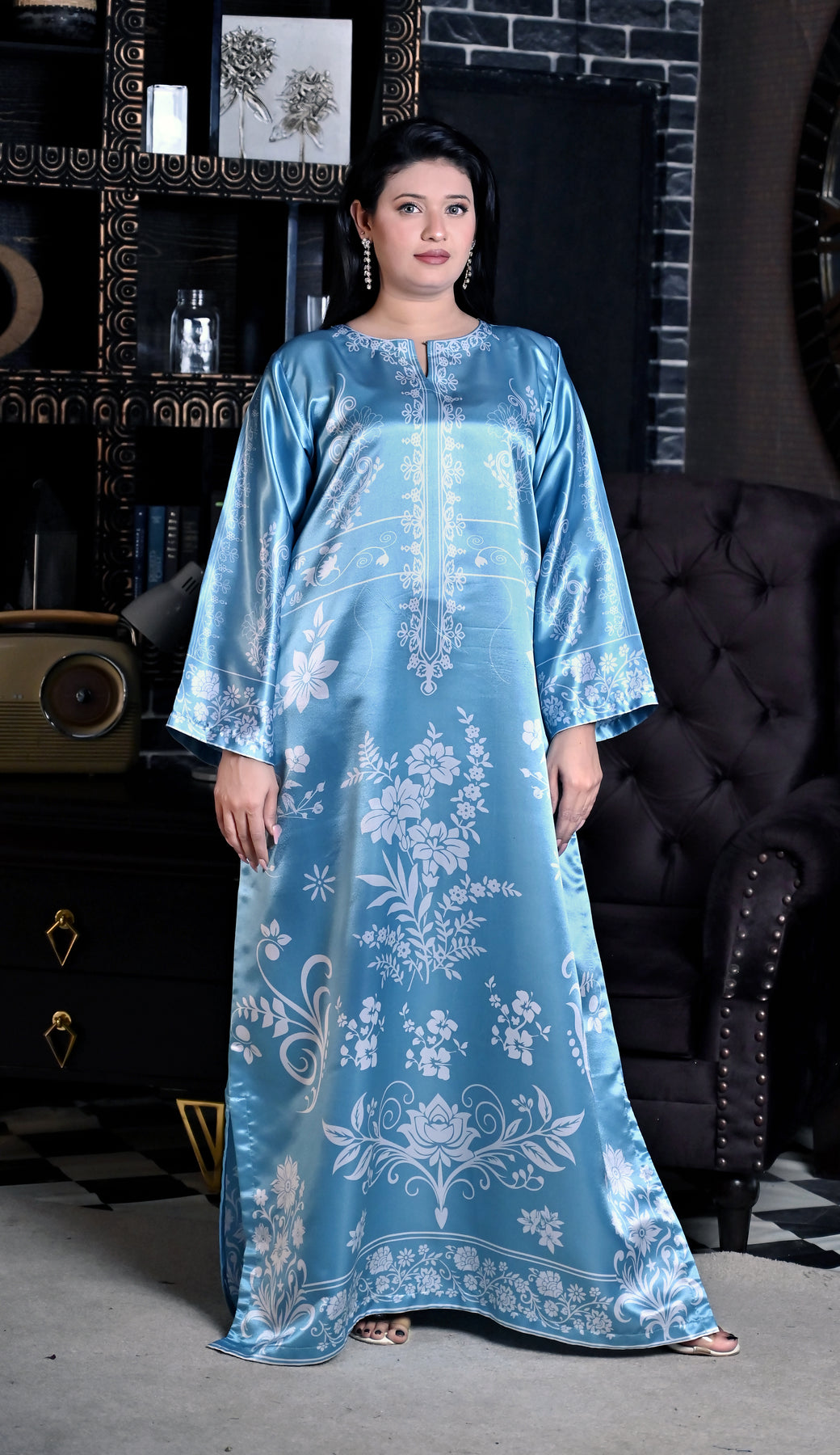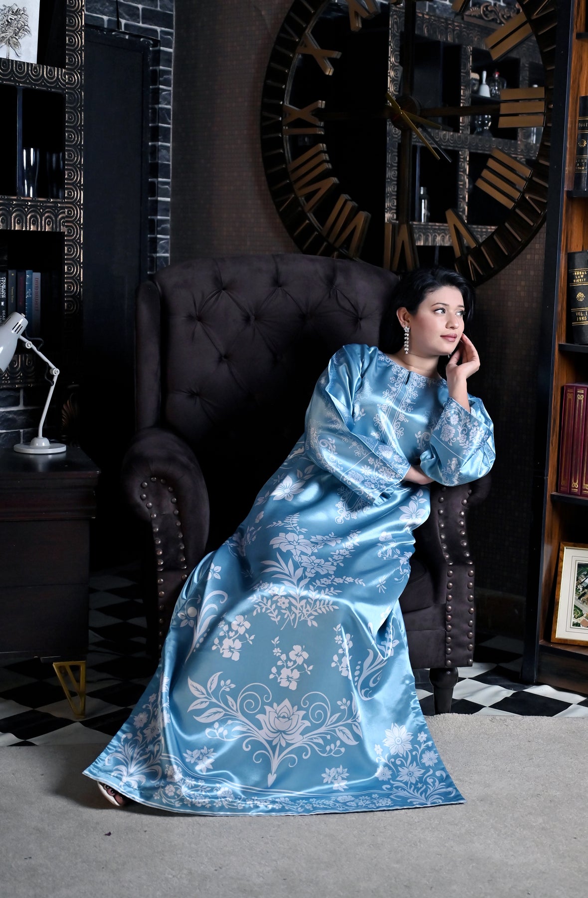 The Celestia Bloom Kaftan is a celebration of elegance and refined beauty. Crafted in a soft and breathable fabric, this kaftan drapes gracefully, offering a perfect balance of comfort and sophistication. Its powder blue base is adorned with intricate floral patterns symbolizing purity and timeless charm. The flowing cut with wide sleeves ensures effortless movement, making it a versatile choice for both day and evening occasions.