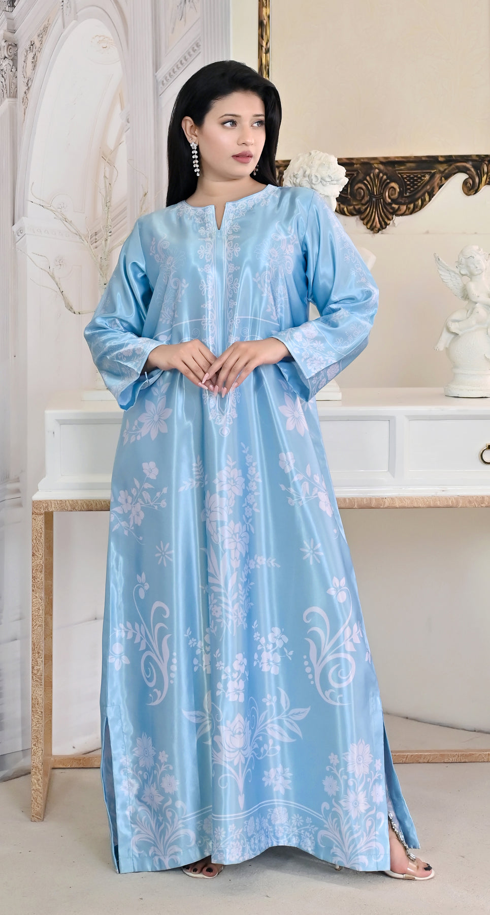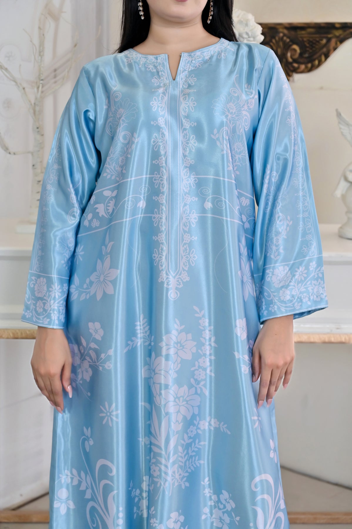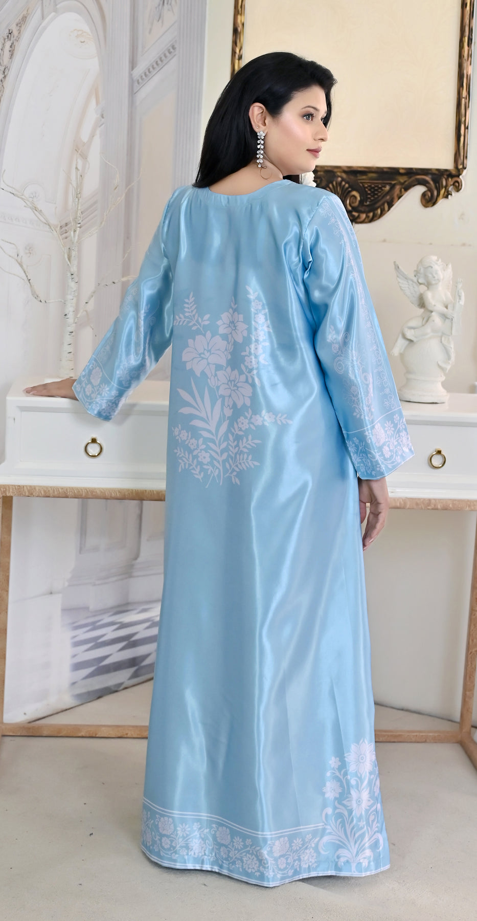 The Elysian Bloom Kaftan is a statement of elegance. This sky-blue masterpiece adorned with delicate floral accents, it strikes a perfect balance between comfort and modern charm. Its flowing silhouette, relaxed fit, wide sleeves, and detailed borders make it the perfect choice. This kaftan is perfect for both day and evening occasions — from refined gatherings to special events at home.