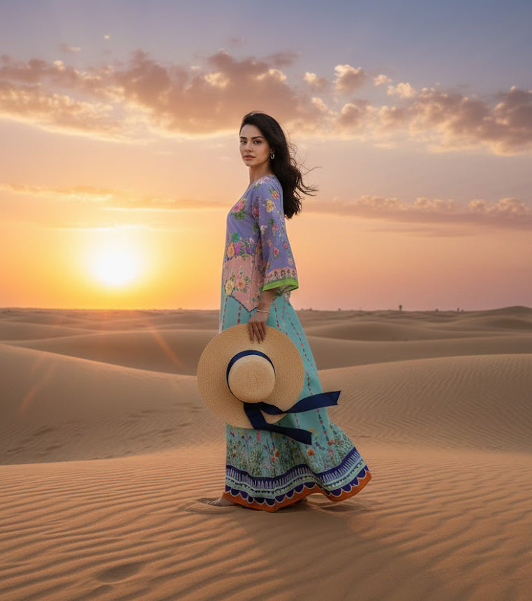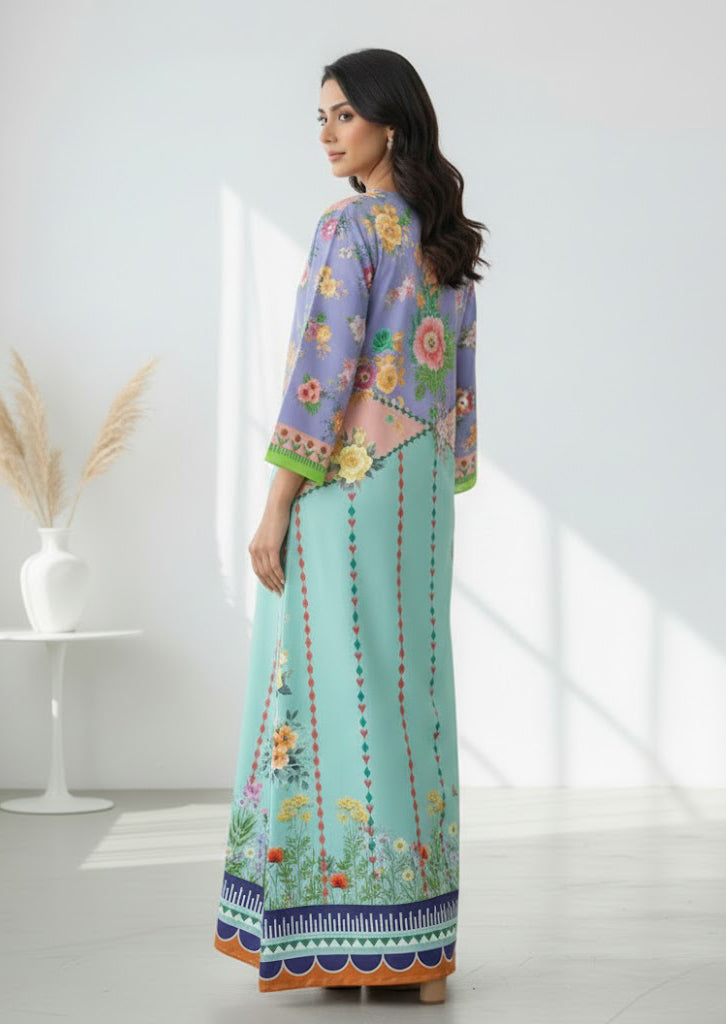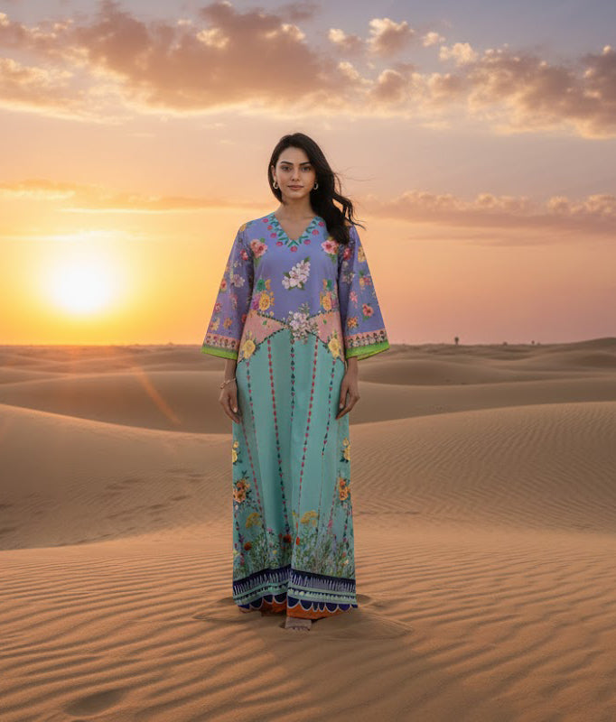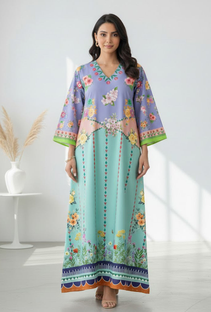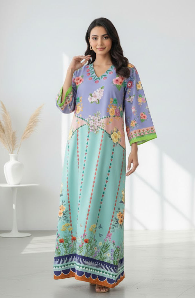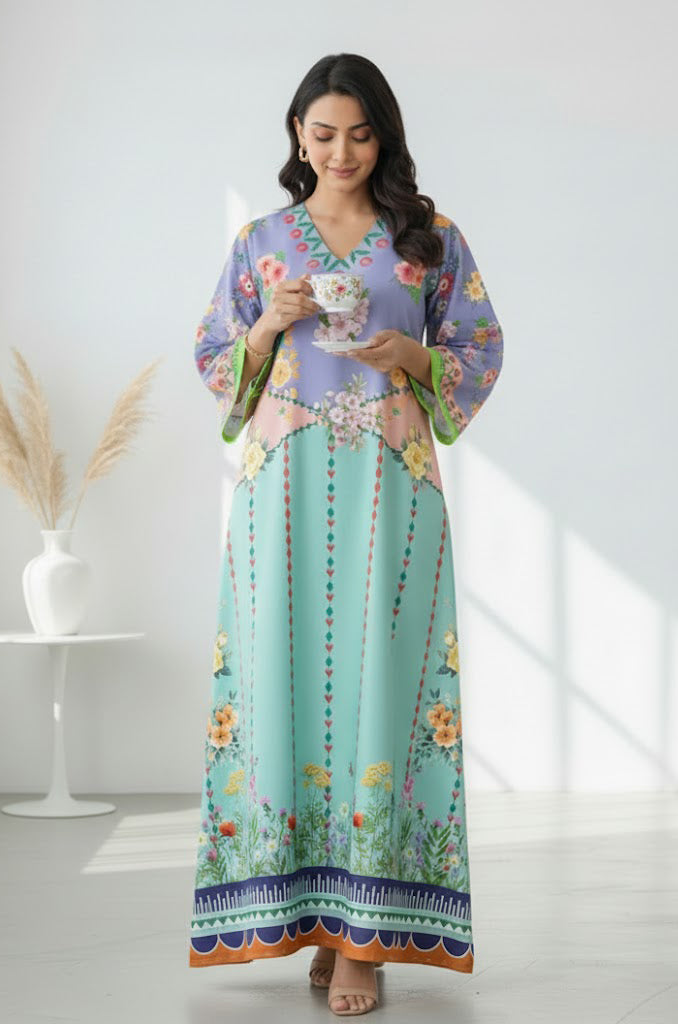 Elevate your everyday elegance with the Liyana Grace Kaftan. this kaftan features a soothing mint base paired with a lilac floral top, beautifully balanced with delicate garden-inspired prints. Made from luxurious soft crepe fabric, it feels light, soft, and comfortable all day. Its loose and flowing style gives a graceful shape to every figure— A stunning piece that makes every woman feel confident and beautifully refined. This kaftan brings a fresh, graceful charm to your wardrobe.