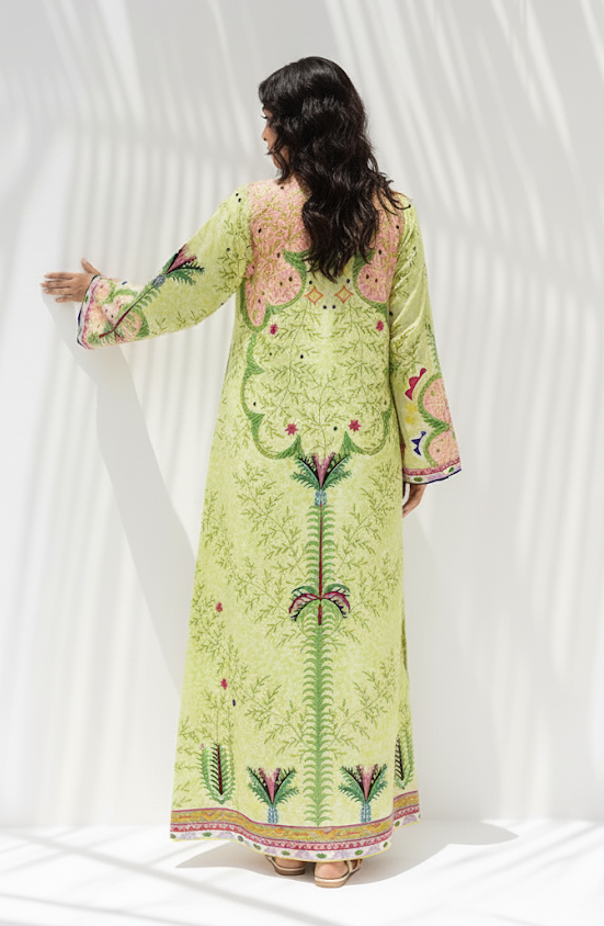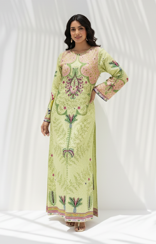 The Nayla Verde Kaftan, crafted from premium, soft, breathable crepe fabric, is a graceful expression of elegance and comfort. Its refreshing light green base is adorned with delicate pink and deep green motifs, creating a look that is both vibrant and refined. With wide flowing sleeves and a relaxed silhouette, this kaftan drapes beautifully, making it the perfect choice for everyone.