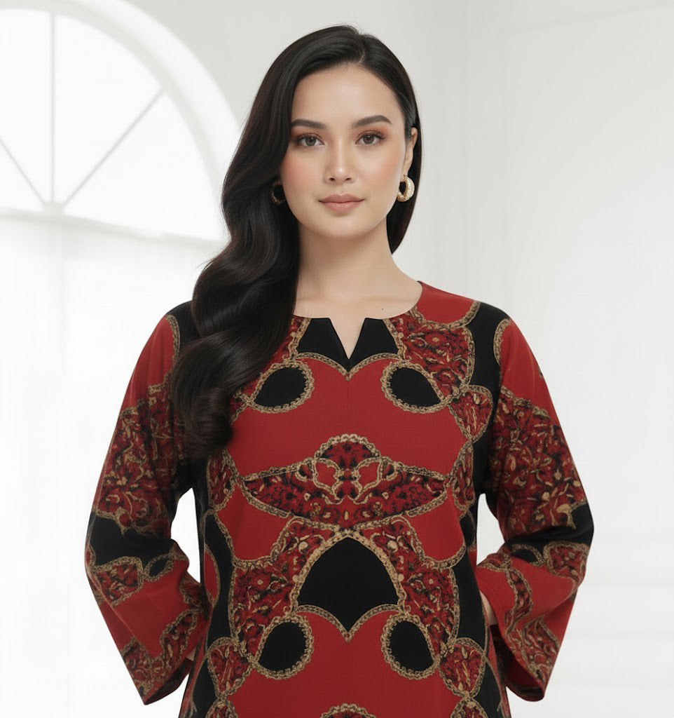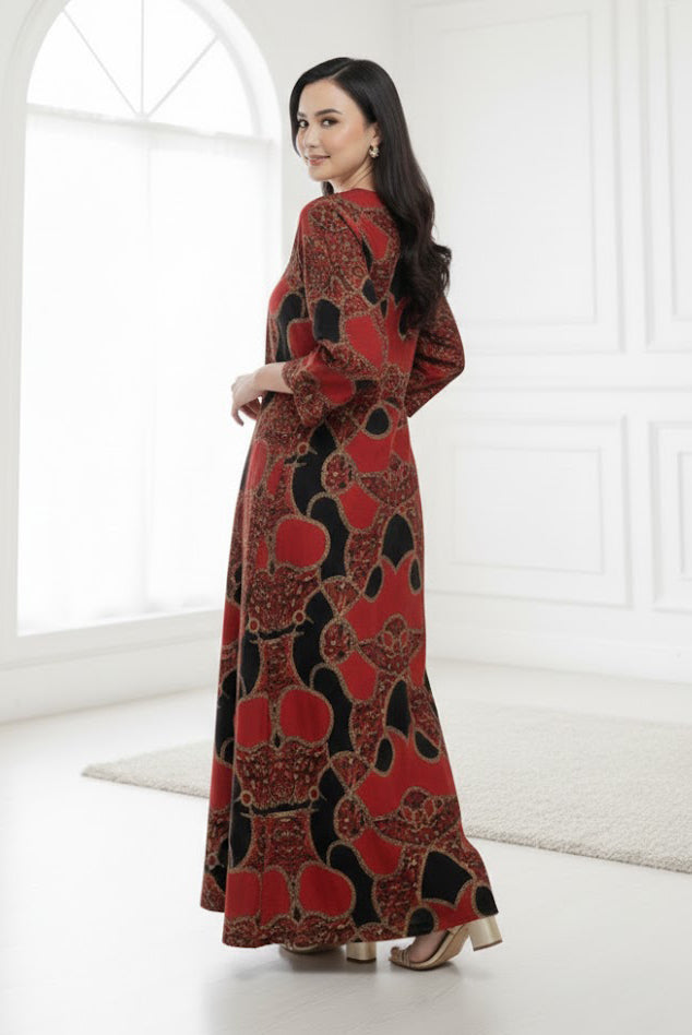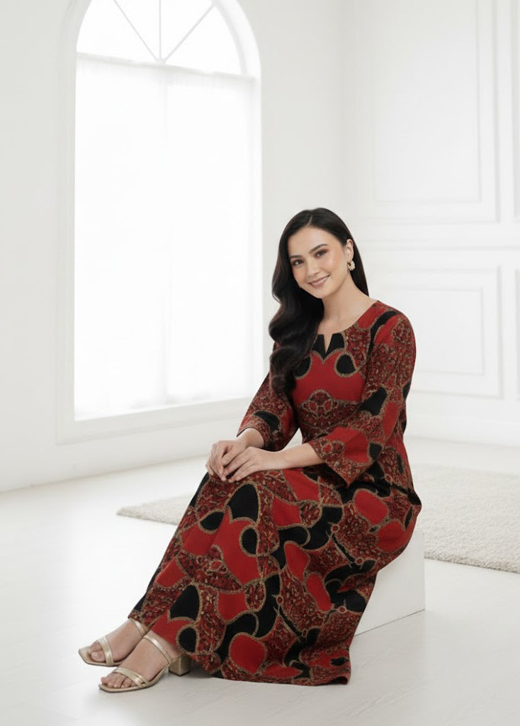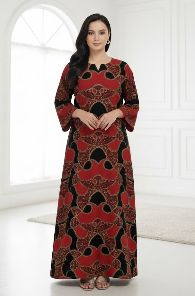 A stylish expression of modern elegance , the Rania Noir Kaftan features rich crimson tones blended with deep black in a striking, symmetrical design. Its clean lines and graceful silhouette create a bold yet refined look. Crafted from soft and breathable premium crepe fabric for a graceful fall and effortless comfort. Confident, timeless, and effortlessly chic—this kaftan is a standout wardrobe essential. Style it with minimal accessories for a chic daytime look, or elevate it with statement jewelry for special occasion.