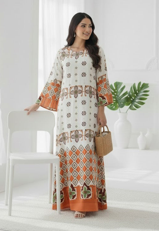 This kaftan features a modern design with a soft ivory base enriched by terracotta and olive-toned patterns. The mix of structured geometric lines and subtle floral elements gives it a fresh yet timeless look. Crafted from soft and breathable premium crepe fabric for a graceful fall and effortless comfort. Its flowing silhouette and wide sleeves offer effortless comfort while maintaining an elegant, refined look. Style it with minimal accessories for a chic daytime look, or elevate it with statement jewelry for special occasion.