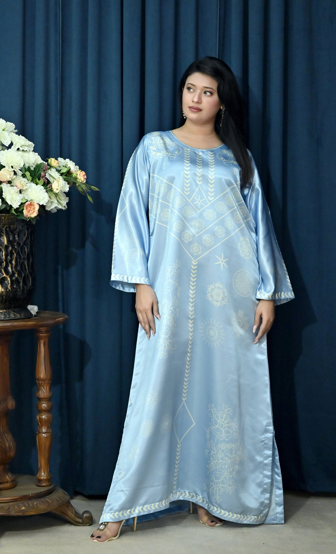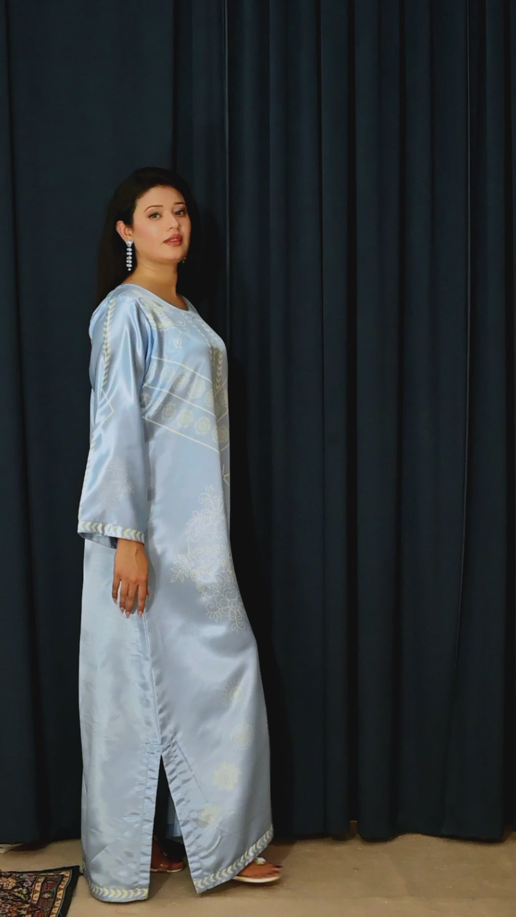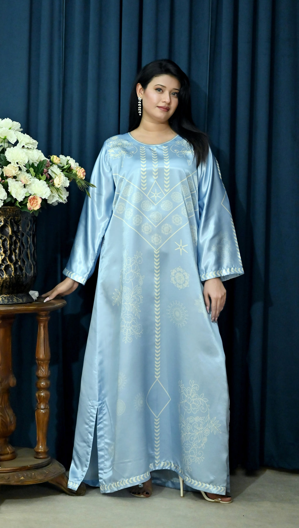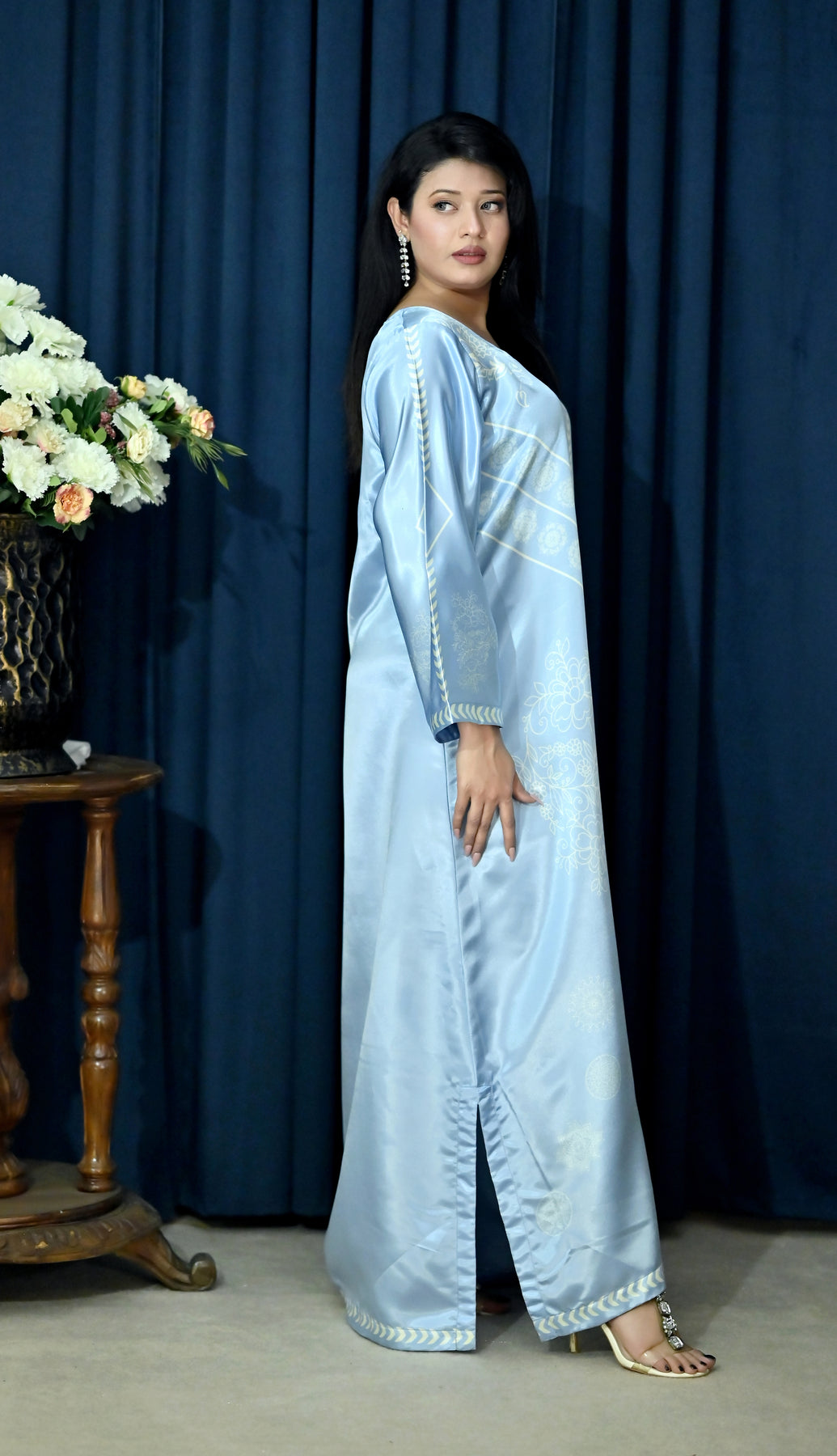 Elevate your style with the Sapphire Luxe Kaftan,a stunning blend of luxury and comfort. Designed in a serene sapphire-blue hue, crafted from soft and breathable fabric. The flowing silhouette, side slit detailing, and graceful full sleeves create a perfect balance of modern refinement and traditional elegance. Whether styled for a festive evening, a formal gathering, or a luxurious at-home look, this Kaftan makes every occasion feel special.