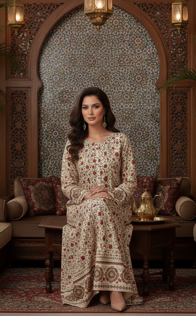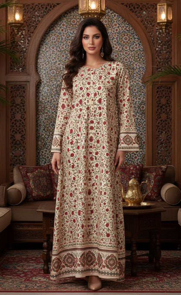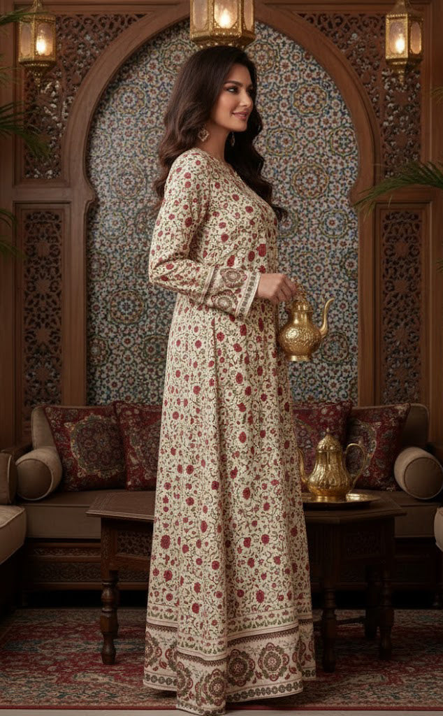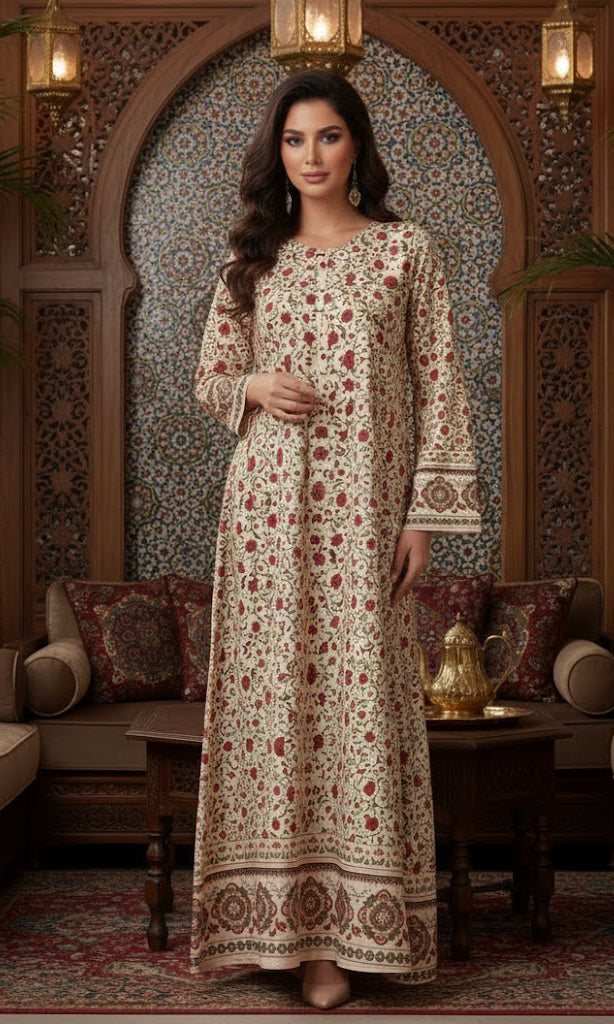 The Zareen Floral Kaftan is all about comfort and style. Made from luxurious, soft & breathable crepe fabric, it feels light and easy to wear all day. This piece offers effortless flow, breathability that ensures comfort without compromising on style. With colorful floral prints, this kaftan brings a fresh and lively look. It features a soft cream base adorned with intricate red and earthy floral motifs inspired by traditional artistry. This relax fit kaftan is a versatile piece of our collection.
