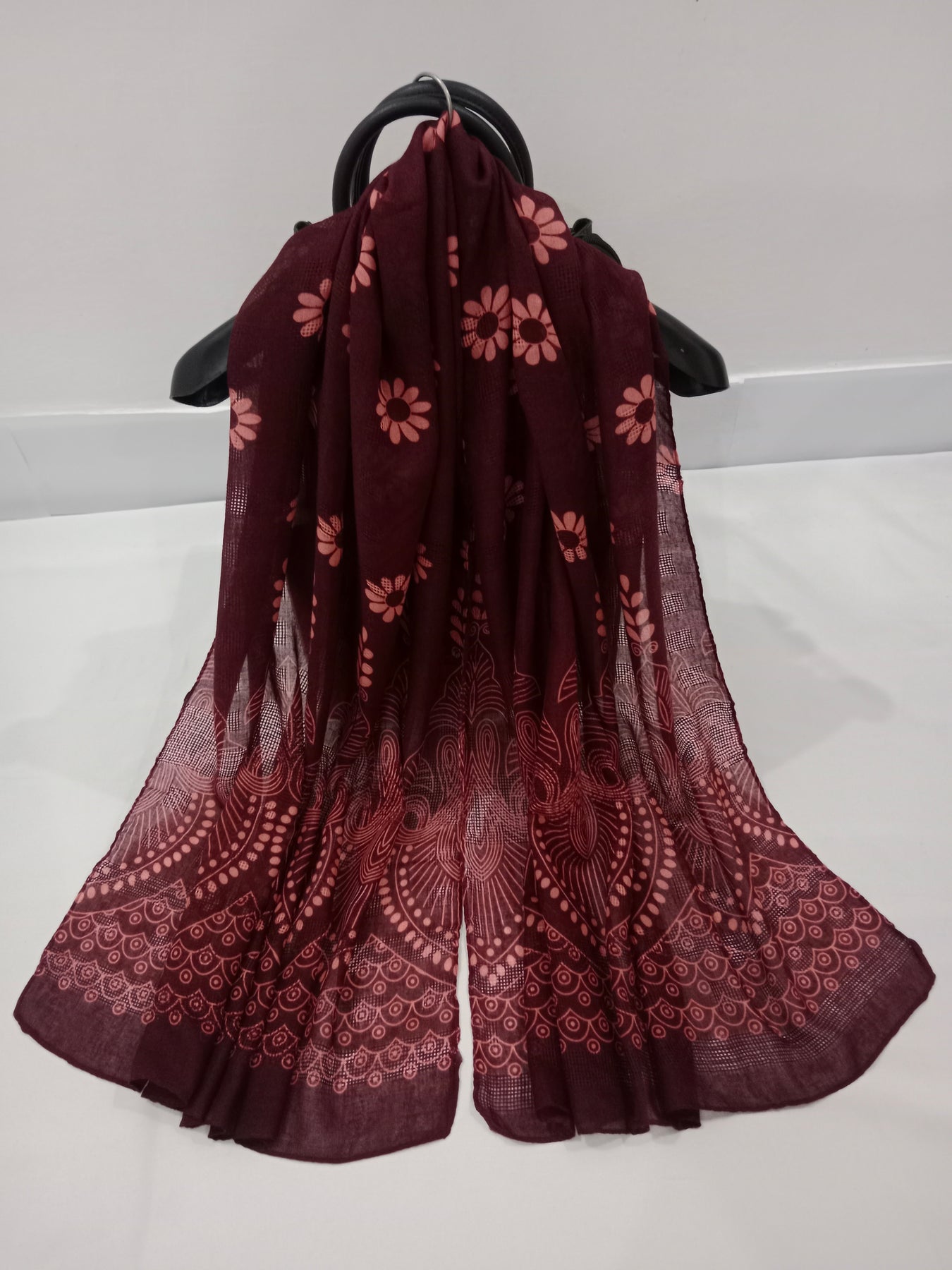 A rich maroon scarf in a polyester, featuring floral prints and an intricate paisley-inspired border. Lightweight, breathable, and wrinkle-resistant, perfect for adding elegance to everyday outfits.