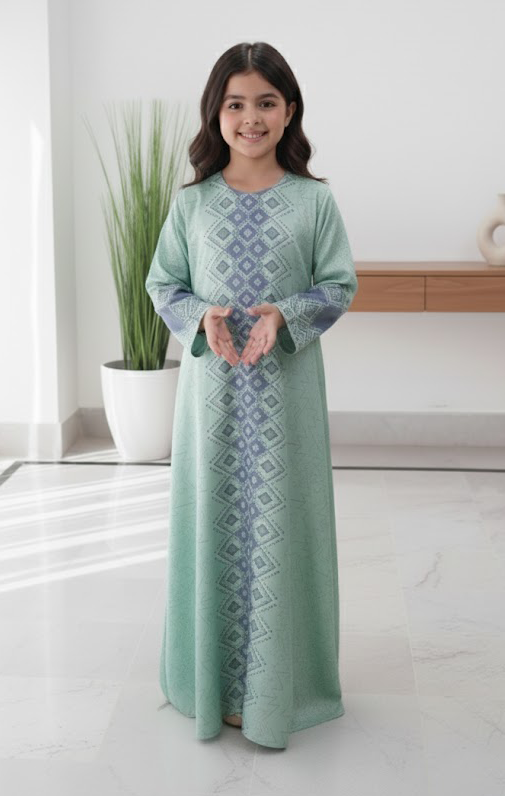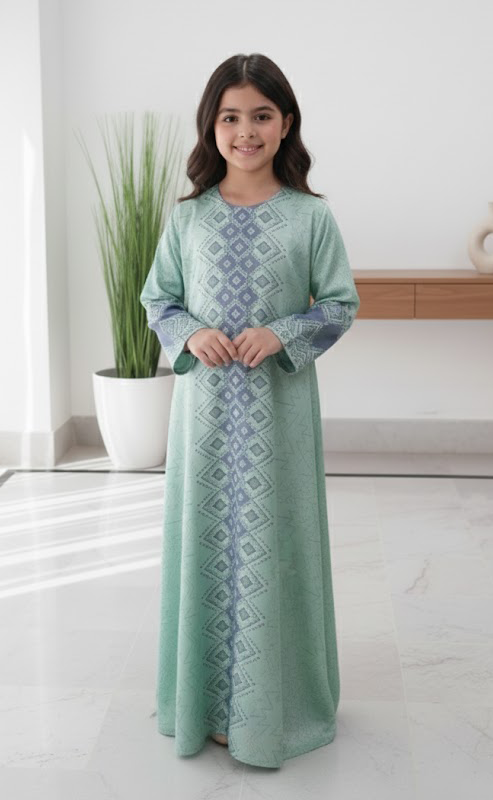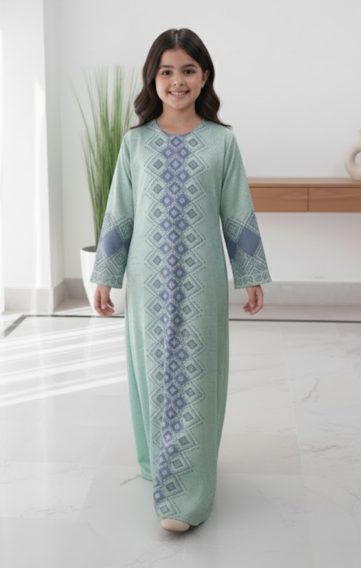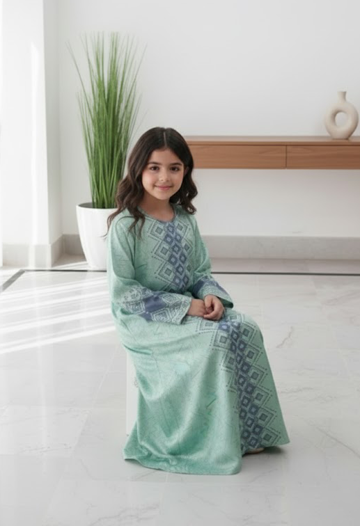 Let your little one shine in this beautiful Mint Breeze Jalabiya, featuring soft geometric patterns and a graceful flow. Made from soft, breathable, and lightweight crepe fabric that doesn’t irritate the skin and keeps your child comfortable all day long. Perfect for casual days or festive gatherings!